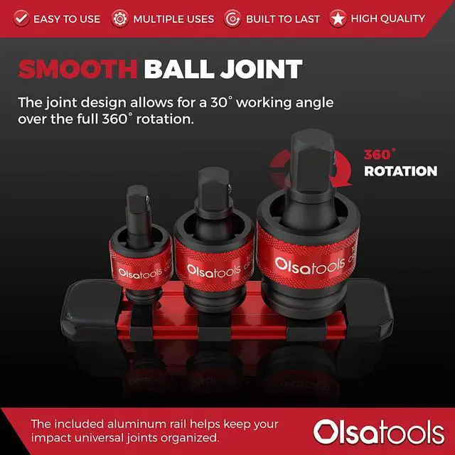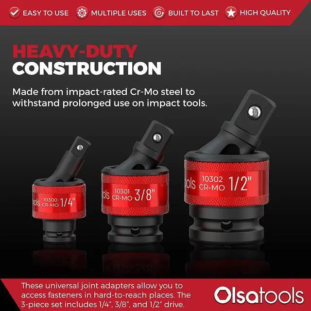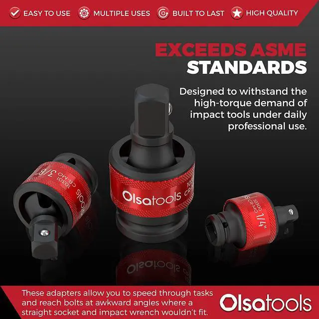 WORK QUICKLY & PRECISELY - Get into those narrow spots effortlessly and quickly with the precision that you need. Our universal impact joints are built to easily reach into tight, cramped spaces where a straight socket on your impact gun just won't fit. This time-saving impact universal joint set will make it easy to remove fasteners with an impact wrench, even at odd angles.