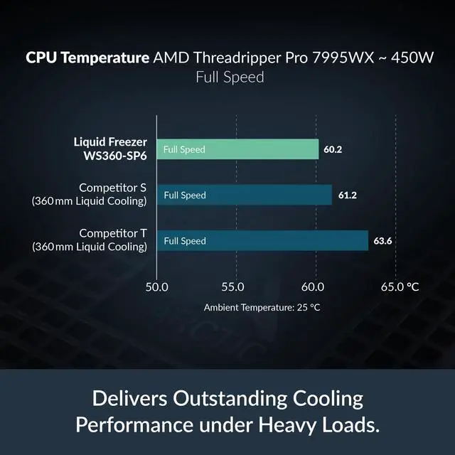 Thanks to its radiator design and powerful fans, the Liquid Freezer WS360-SP6 offers excellent cooling under heavy load, while its noise level is comparable to competing products.
