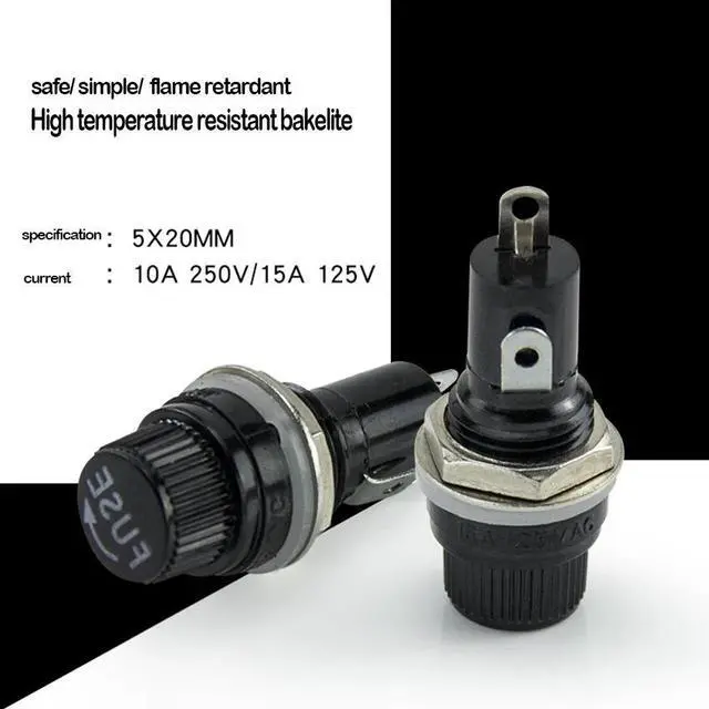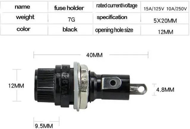5*20mm 15A 125V glass tube fuse holder, fuse hole 12mm, for 5*20mm panel mount