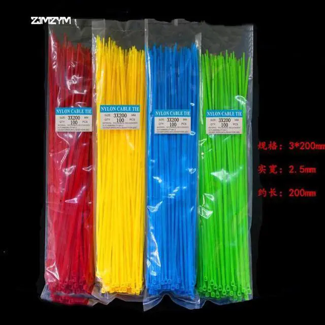 Hot selling 100PCS/bag 3*200mm width 2.5mm Colorful Factory Standard Self-locking Plastic Nylon 8'' Cable Ties,Wire Zip Tie