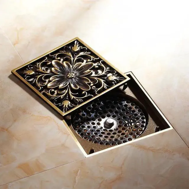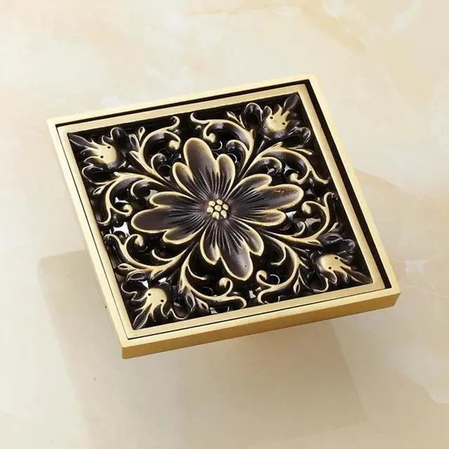Antique Brass Art Carved Flower Floor Wast Grate Floor Shower Drain
