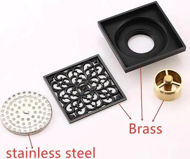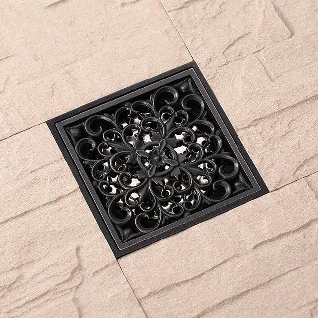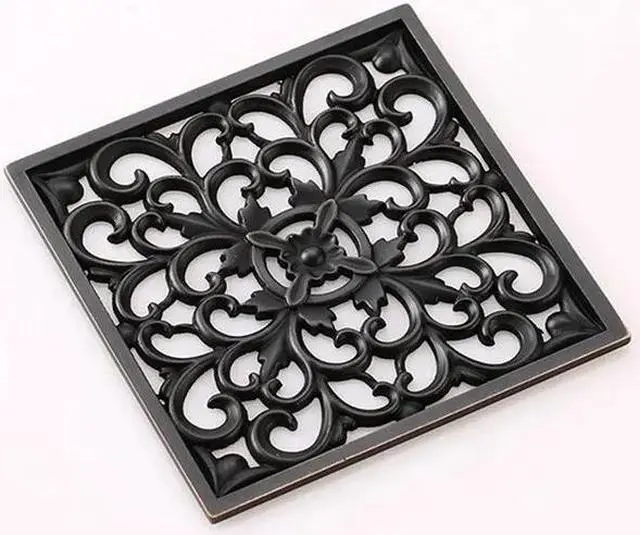 Flower Carved Art Square Bathroom Floor Drain 4" Antique Brass