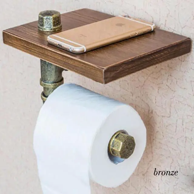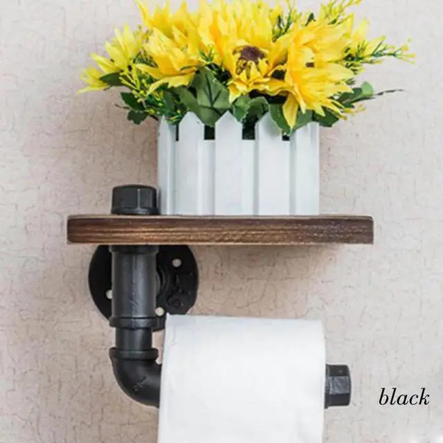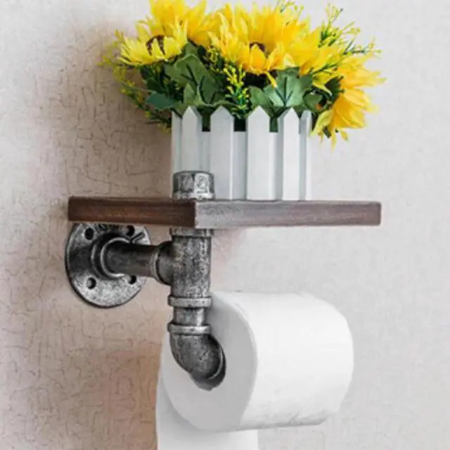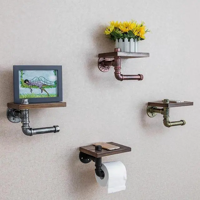 Urban Industrial Wall Mount Wood Storage Shelf Iron Pipe Toilet Paper Holder Roller Restaurant Restroom Bathroom Decoration