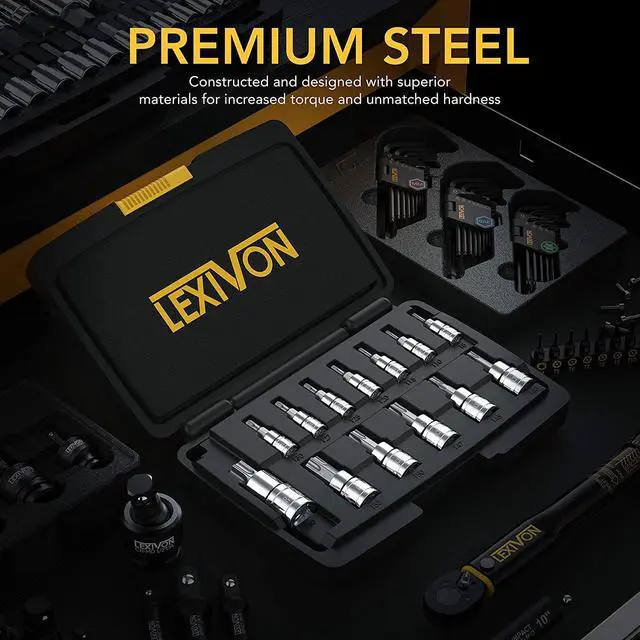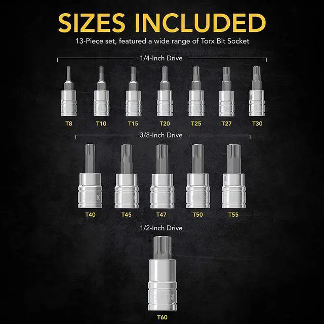 PREMIUM - 13-Piece set, Featured a wide range of Torx Bit Socket. Crafted and Designed with superior materials for increased torque and unmatched hardness.