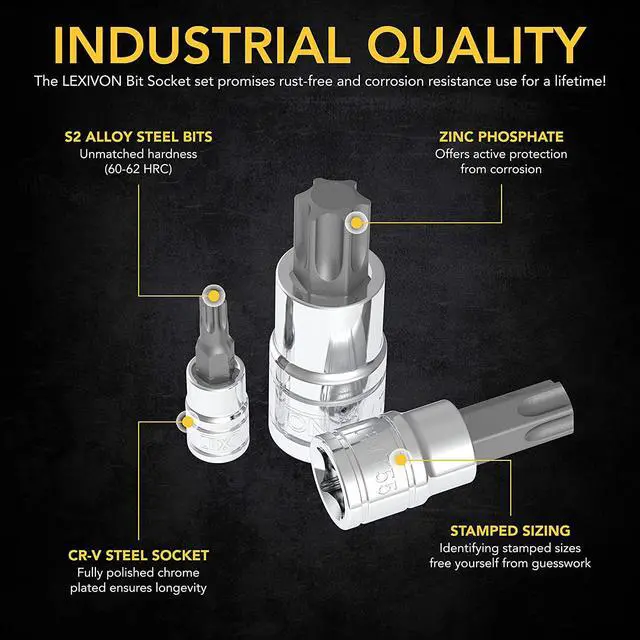 LONGEVITY - Complete rust and corrosion resistance with fully polished, Chrome plated mirror finish sockets and Zinc Phosphate bits treatment.