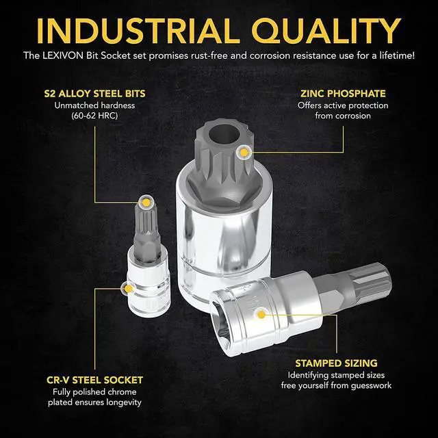 LONGEVITY - Complete rust and corrosion resistance with fully polished, Chrome plated mirror finish sockets and Zinc Phosphate bits treatment.