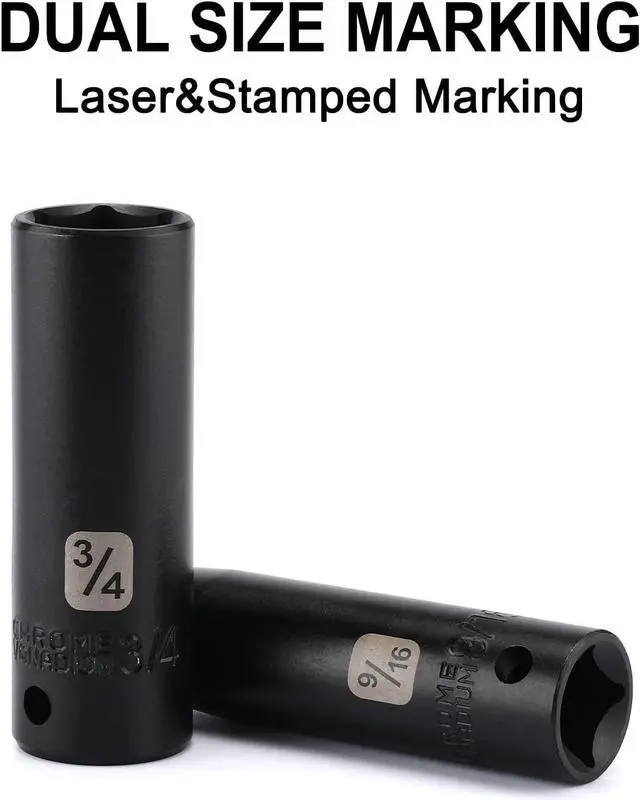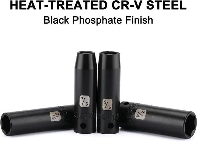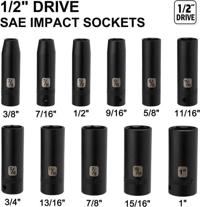 SAE deep sockets: 3/8", 7/16", 1/2", 9/16", 5/8", 11/16", 3/4", 13/16", 7/8", 15/16", 1"