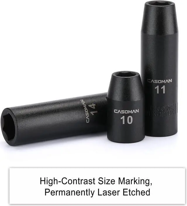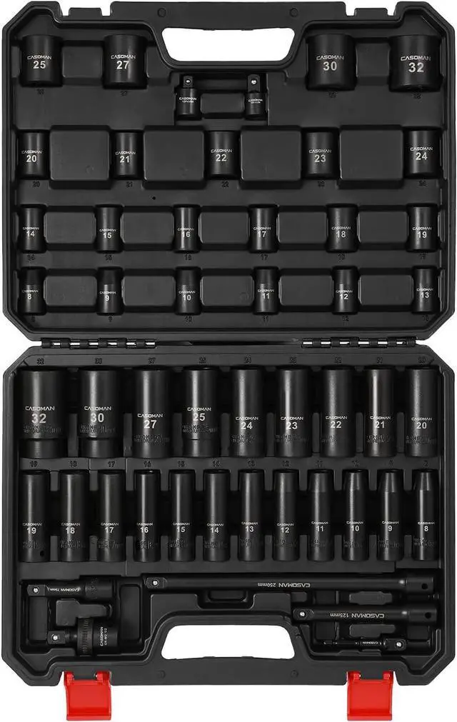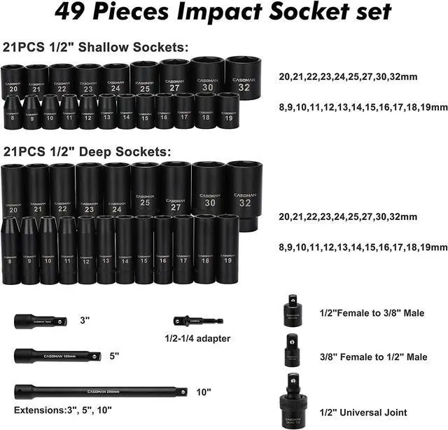 Dr. deep/shallow metric sockets: 8, 9, 10, 11, 12, 13, 14, 15, 16, 17, 18, 19, 20, 21, 22, 23, 24, 25, 27, 30, 32mm; 3 pieces 1/2"