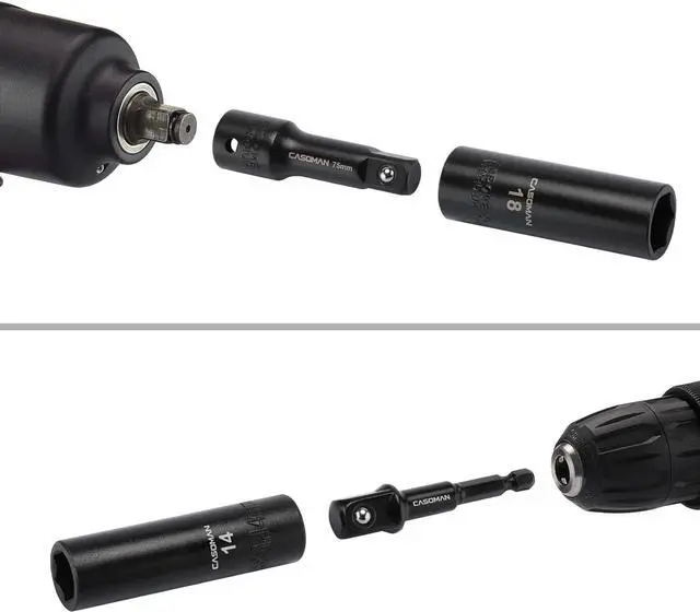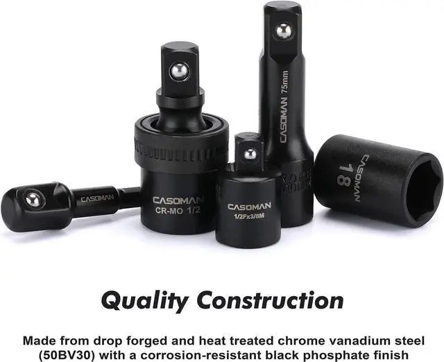 Dr. extension bars: 3", 5" 10"; 3 pieces 1/2Dr. adapters: 1/2 (F) to 3/8 (M), 3/8 (F) to 1/2 (M), 1/2"-1/4" adapter; 1 piece 1/2Dr. impact universal joint.