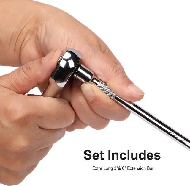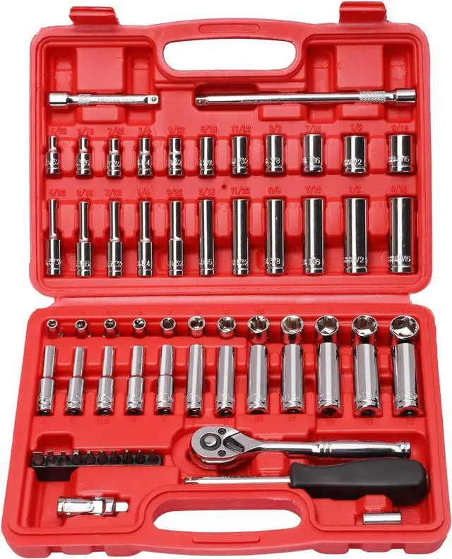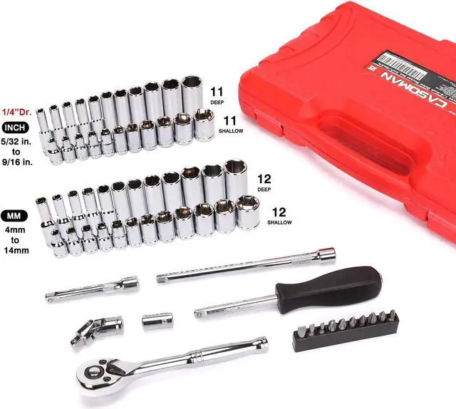 This 1/4" Socekt Set Includes 46 pcs sockets in SAE and metric, deep and shallow, from 4mm to 14mm, 5/32-Inch - 9/16-Inch, 6 points, high torque, Cr-V sockets.
