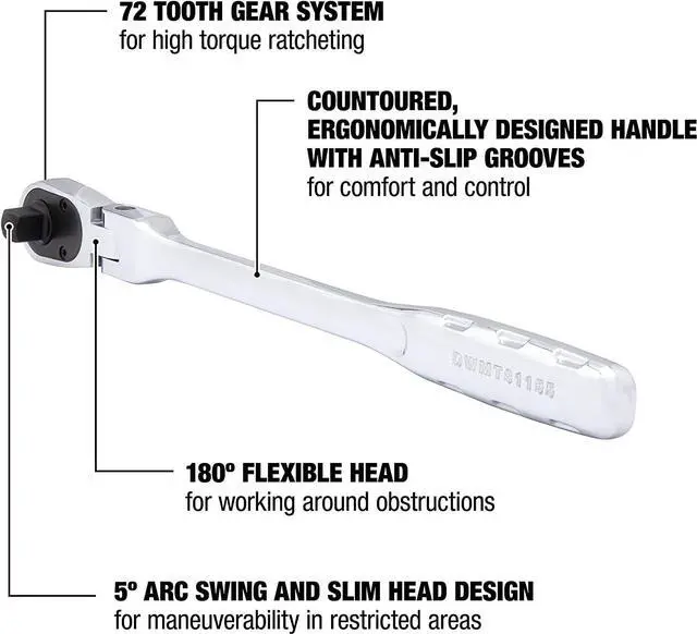5-degree arc swing and slim head design of the ratchet wrench is made for maneuverability in restricted areas