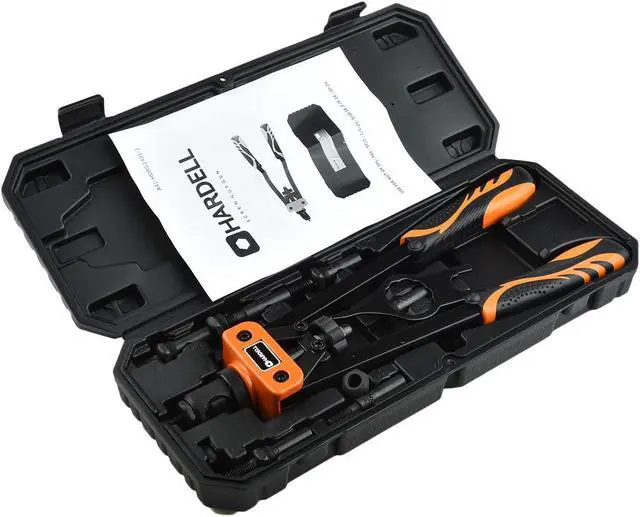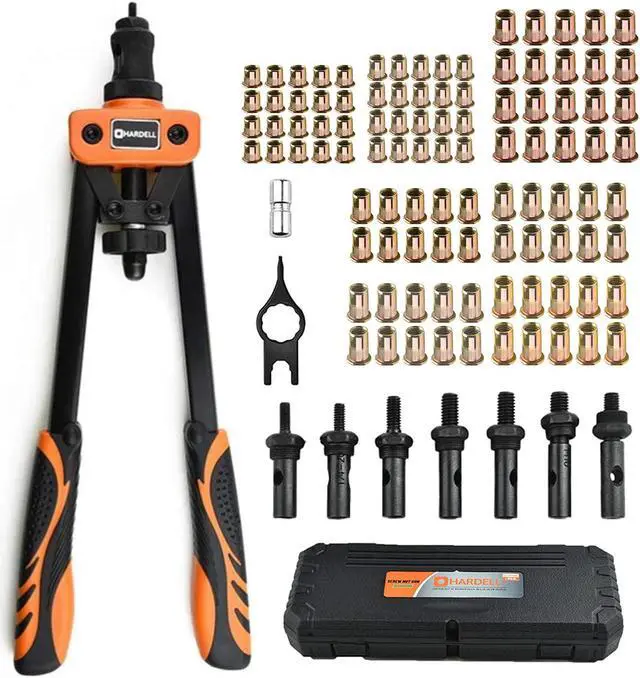 Multiple AccessoriesHARDELL rivet nut tool kit complete with 7pcs interchangeable mandrel(M6, M8, M10, 10-24, 1/4"-20, 3/8"-16, 5/16"-18)and 100PCS rivet nuts. A rugged carrying case is available to keep all the tools and accessories.