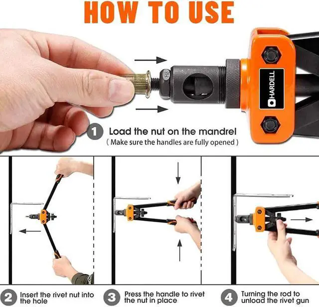 Wide ApplicationsThe Hand rivet nut setter kit with ergonomic handles maximizing leverage and for easy operation, saves energy. Delicate Shape Heavy Duty Nut rivet tool is Ideal for Working in Hard-to-reach Areas. Great for Vehicle modifications/Furniture/Metal/Iron/plastic/plate riveting.
