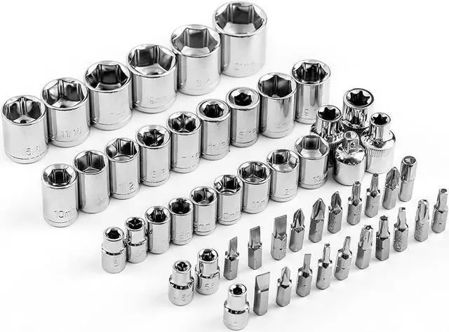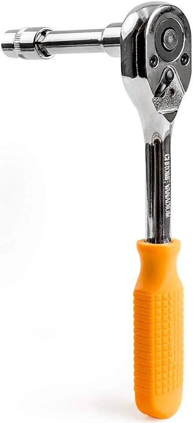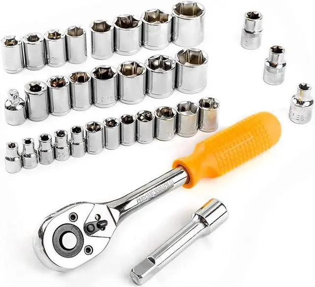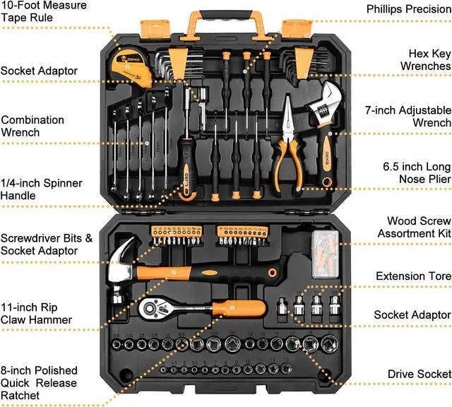 INCLUDES: Comprehensive assortment of professional-grade wrenches, ratchets, a complete range of SAE and metric-sized sockets and screwdriver bits, hammer, tape measure, pliers, also includes 1/4 inch and 3/8inch socket set, ensure accurate size. And the 72-tooth ratchet easily shift to change direction by flick of 5-degree switch.