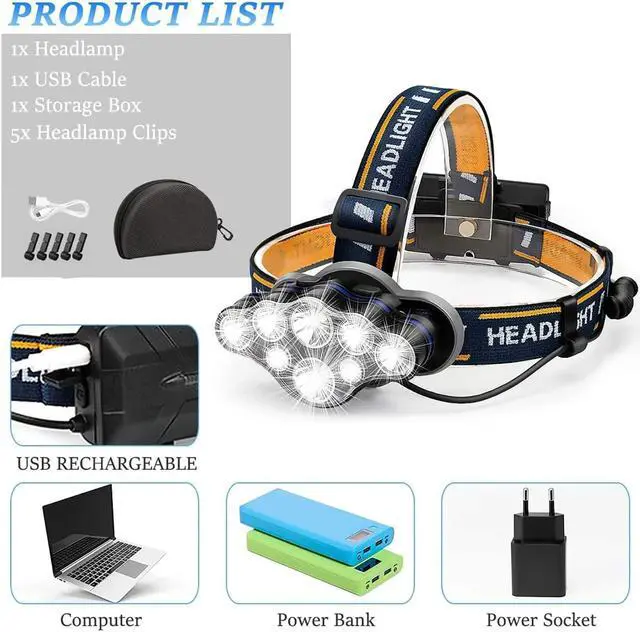 What We ProvidePackage content include 1 rechargeable headlamp, 1 USB cable, and 5 Head Lamp Clips, our head light will come with a exquisite and large capacity Storage Box, It's a perfect gift for your families, friends, workmates etc.
