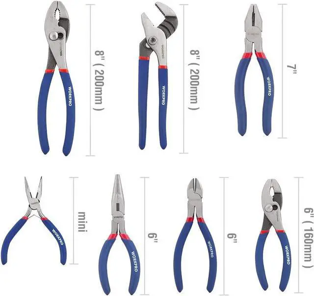 The set includes: 8-inch groove joint, 8-inch and 6-inch slip joint, 7-inch linesman, 6-inch and 4-1/2 inch long nose, and 6-inch diagonal pliers