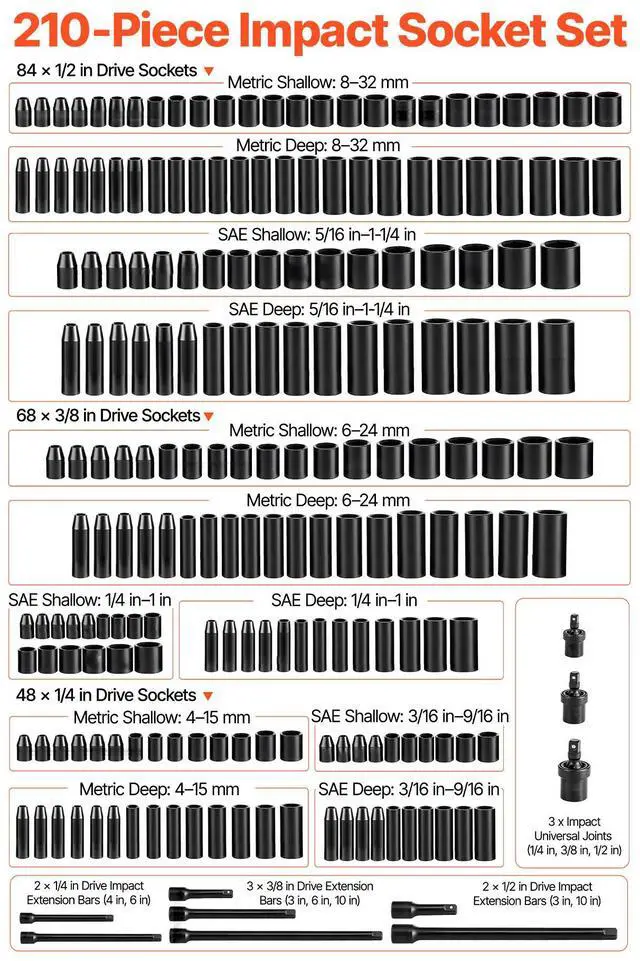 Socket Quantity: 200 Sockets (48 x 1/4 in, 68 x 3/8 in, 84 x 1/2 in)