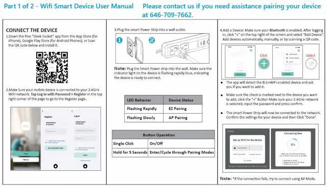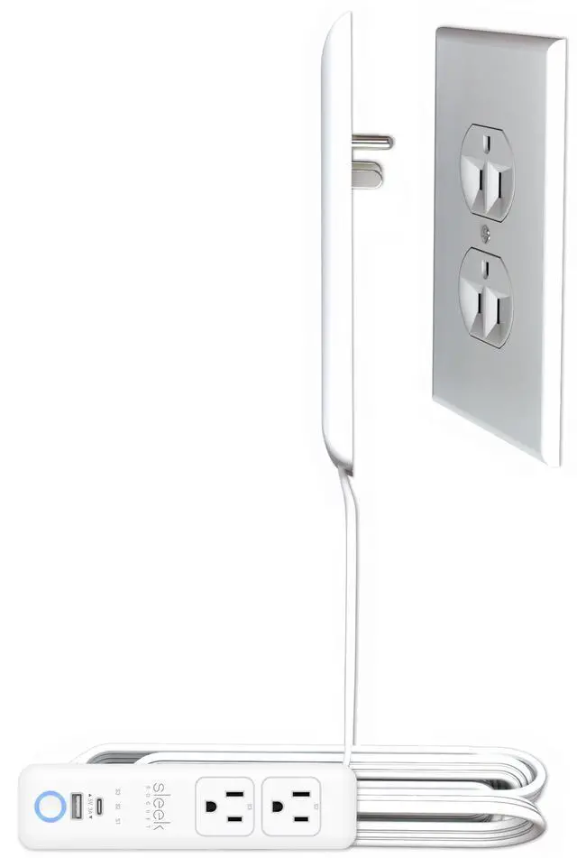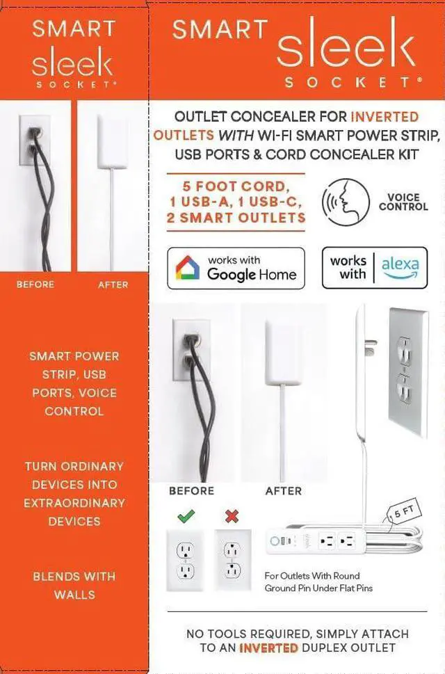 Transform your home's outdated outlets into sleek, smart hubs with the Smart Sleek Socket the ultimate blend of innovative design and cutting-edge functionality. This no-tools-required wonder seamlessly attaches to any standard, mid-size, or oversize duplex outlet, concealing bulky plugs and cords while delivering two smart AC outlets, a high-speed USB-A (5V/3.1A), and USB-C port for effortless device charging. Powered by 2.4GHz Wi-Fi and compatible with Alexa and Google Home for hands-free voice control, it also offers control through the Sleek Socket app, available on the Google Play Store (the official digital storefront for Android devices) and the Apple App Store (the official digital storefront for Apple devices). This allows a "dumb device" (i.e., lamp, fan, and other household devices) to be controlled with Sleek Sockets smart power strip. With a 5-foot cord and included adhesive cord concealer kit, you can route wires neatly along walls, enabling furniture to sit flush against them for a clutter-free, modern aesthetic. Rated for 13A/125V/1625W, it's UL and CSA certified for safe indoor use perfect for powering lamps, fans, chargers, or holiday lights without compromising style or safety.