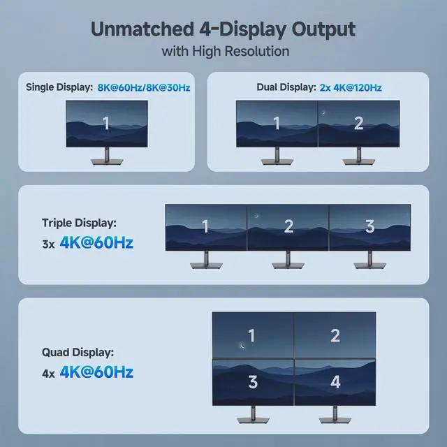 • Unmatched 4-Display Output with High Resolution: Elevate your workspace with the 4K Quad Display USB C MST Adapter, supporting up to 4 monitors. Achieve 8K@60Hz/4K@240Hz over DisplayPort 2.1 or 8K@30Hz over HDMI 2.1 for a single display. For multi-display setups, enjoy 4K@120Hz on dual displays and 4K@60Hz on triple or quad setups, with DSC 1.2 enabled for optimal performance.