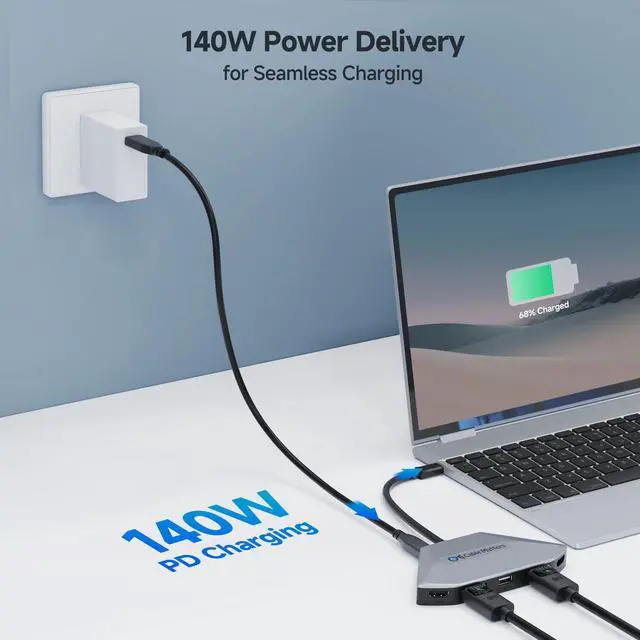 • 140W Power Delivery for Seamless Charging: Stay powered up while driving multiple high-resolution displays with the 140W Charging. This USB C Hub Multiport Adapter ensures uninterrupted charging, keeping your laptop or device fully powered, whether you're tackling intensive tasks or enjoying extended gaming sessions.