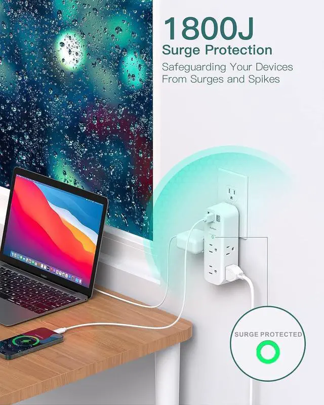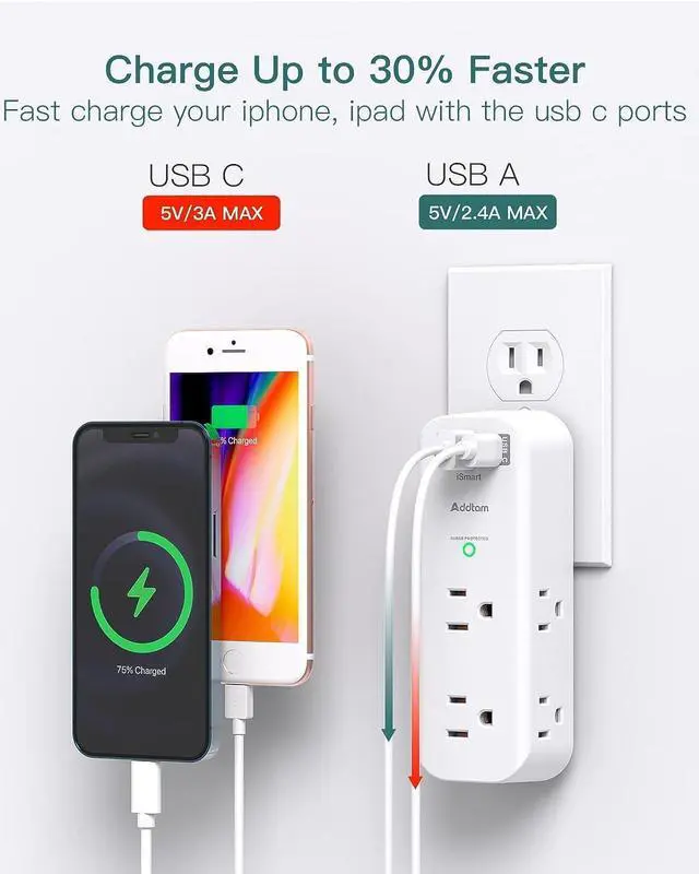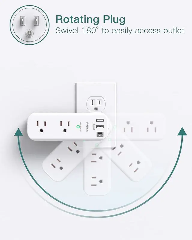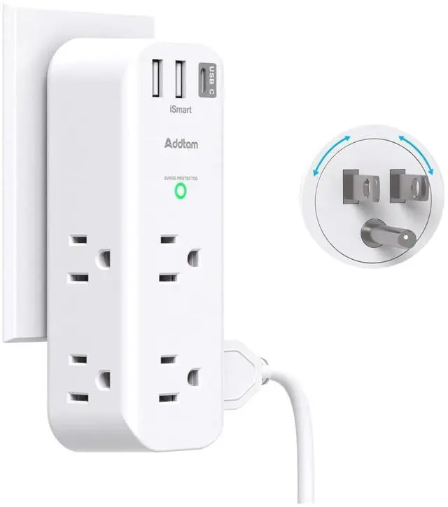 Surge Protector Outlet- This surge protector wall mount features 1800 Joules surge protection together with overload protection, short-circuit protection, over current protection, over-voltage protection and overheating protection. Addtam usb wall charger surge protector is much more quickly and reliably than the traditional MOV surge protector circuit. ("SURGE PROTECTED" indicator light on to show your devices are protected) Multi Function USB Wall Outlet- The electrical outlet extender with 6 widely AC outlets and 3 USB charging ports (1 USB C), you can easily power up to 9 devices at the same time. The outlet splitter with 3 sided slim design, it gives you way more power options while taking up hardly any space Multi Plug Outlet with Rotating Plug- The outlet extender with usb ports can be turn left and right 90 degrees conveniently, it can be adjusted manually to get the right angle for you. 3 sides 1.5 inches large space beetween adapter outlets on the side which can easily fit for big head chargers. And you can take this small surge protector to anywhere even for travel Wall Outlet with USB Ports- The usb wall charger surge protector with 3USB charging ports (total output DC 5V/3A), USB C charging ports built in smart technolohy, can detect and charge your devices quickly, up to max 5V/3A, USB A charging port features 2.4A Max, compatible with almost all usb devices(the actual current is decided by the demand for