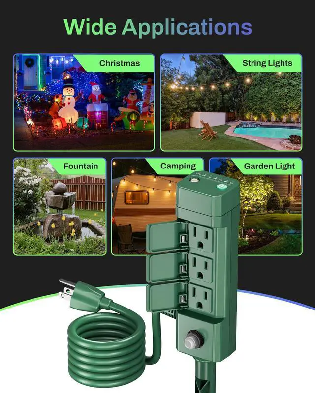 • SPACE-SAVING 6-OUTLET STAKE TIMER: the yard stake timer can be plugged up to 6 devices at a time, making it a nifty space-saving solution for your multiple outdoor lighting needs in one area; comes with a 6-feet green cord that blends in with your garden