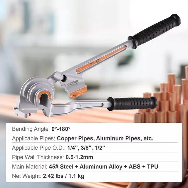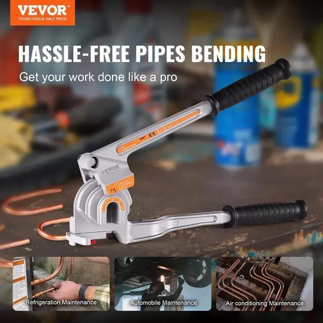 VEVOR lever pipe tube bender, perfect for bending copper, aluminum, thin steel, and stainless steel pipes with 0.5 - 1.2 mm wall thickness. Our 3-in-1 pipe tube bender caters to 1/4in, 3/8in, 1/2in pipe diameters. 0-180° bending ensures uniform force distribution, preventing deformation, flattening.
