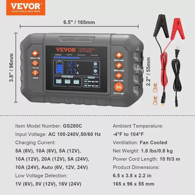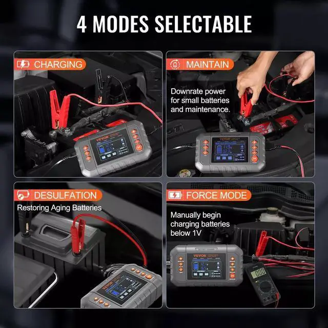 Introducing our car battery charger, compatible with lead-acid batteries (6/12/24V), lithium batteries (12/24V), and LiFePO4 batteries (12/24V). It combines a battery charger, battery maintainer, trickle charger, and battery desulfator in a single unit, covering all your needs!