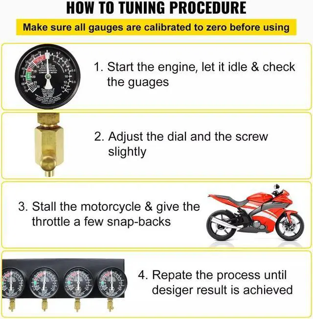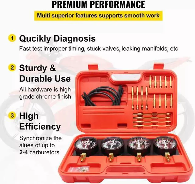 All hardware features a chrome finish with a stable structure and durable construction. And the vacuum carburetor tool can quickly diagnose valve stuck, manifold leakage and synchronize multiple carburetor values.