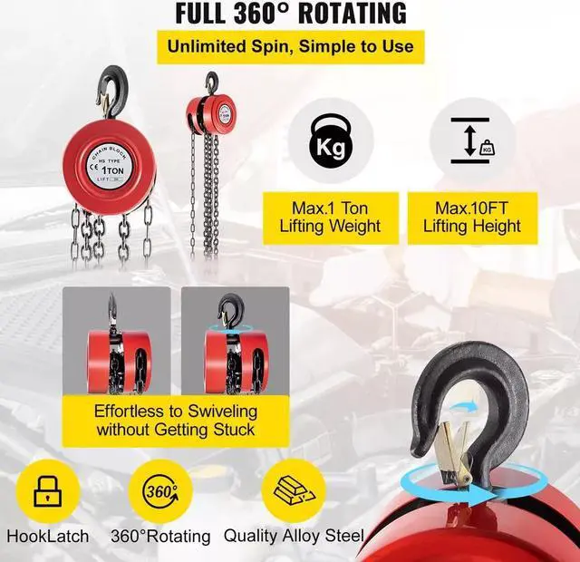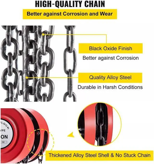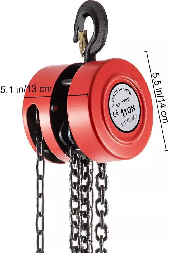 Our manual hand chain block has a maximum lifting capacity of 2200 lbs (1 ton/1000 kg). The peak lifting height is 10 ft/3 man ideal loading assistant for factories and repair shops.