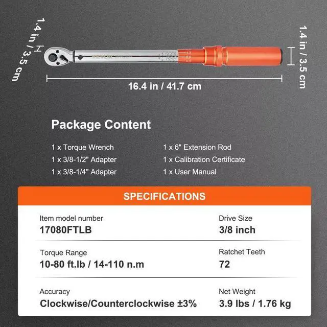 Torque Wrench Adjustable Torque Wrench 3/8" Drive 10-80ft.lb/14-110n.m