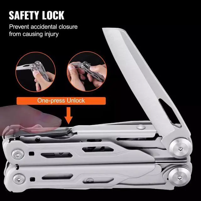 4. Our multi tool pliers come with a pocket clip and sheath for easy carry and storage. In addition, it has an automatic locking function to ensure security during use.