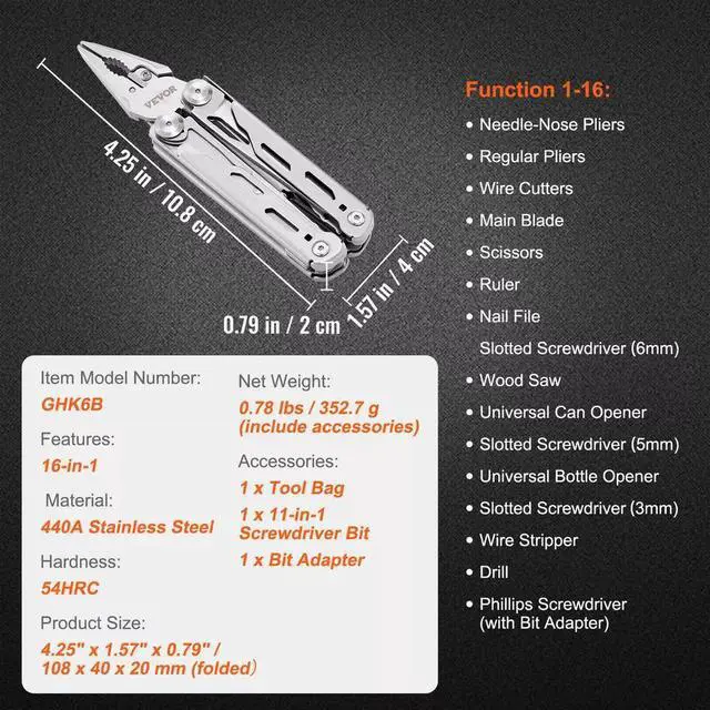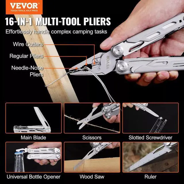 1. This multi tool combines various practical tools, including pliers, main blade, scissors, ruler, wood saw, slotted screwdrivers, etc. A single 16-in-1 multi-tool is equivalent to owning a full set of useful tools, coming in handy whether you're on an outdoor adventure or doing some home repairs.