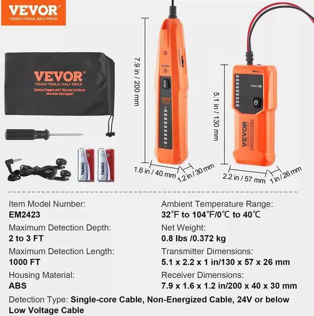 1. Our underground wire locator features 3 ft Max. Detection depth and 1000 ft Max. Detection length for locating non-energized cable and 24V or below low voltage cable, only for single-core cable or dual-stranded cable in parallel. Easily detect and repair broken cables, saving you time and money!