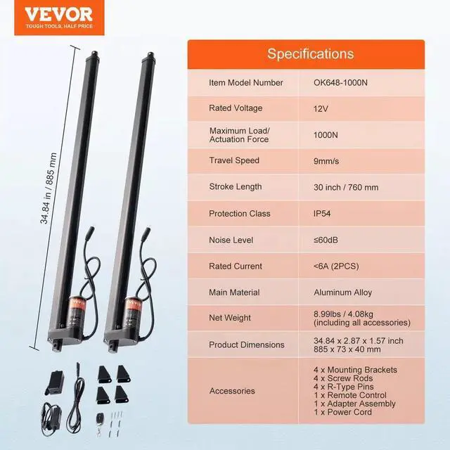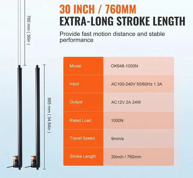 1. Experience 30-inch extended range of motion and 220lbs strong actuation force with VEVOR linear actuator kit & controller! Powered by robust motor and offering precise rotation, it delivers high-efficiency motion for furniture adjustment, automation systems, mechanical equipment, and more.