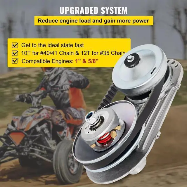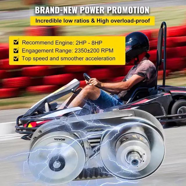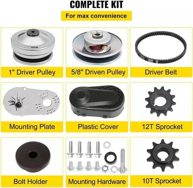 Our go cart torque converter kit has a 1'' Driver Pulley and a 5/8'' bore driven pulley to obtain reliable engagement and complete separation.