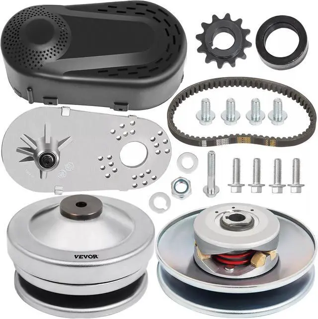 This kart torque converter includes 1 x 1" driver clutch, 1 x 5/8" driven clutch, 2 x teeth sprockets, 1 x plastic assembly cover, 1 x aluminum mounting plate, 1 x drive belt, and a complete set of mounting hardware.