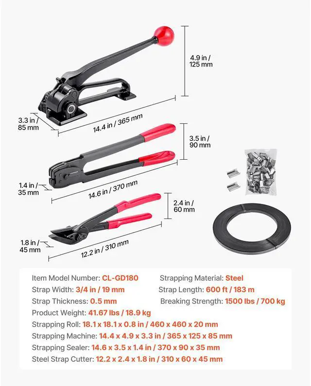 Strapping Machine: 14.4 x 4.9 x 3.3 in / 365 x 125 x 85 mm