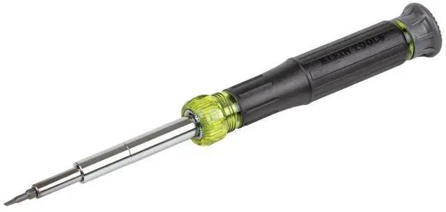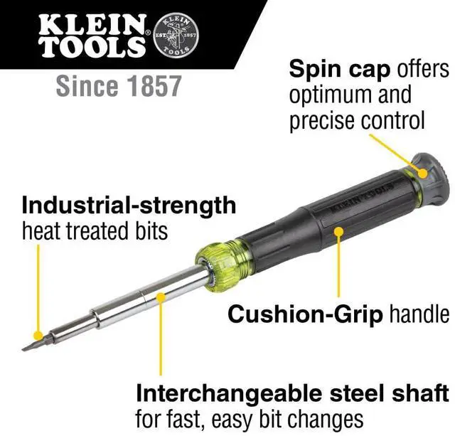Klein Tools' 14-in-1 Precision Screwdriver / Nut Driver features 14 of the most common precision sizes in one tool. The Cushion-Grip handle and spin cap provide outstanding comfort and control. This smartly designed tool contains 6 sizes of integrated steel nut driver shafts that securely hold four double-ended screwdriver bits.