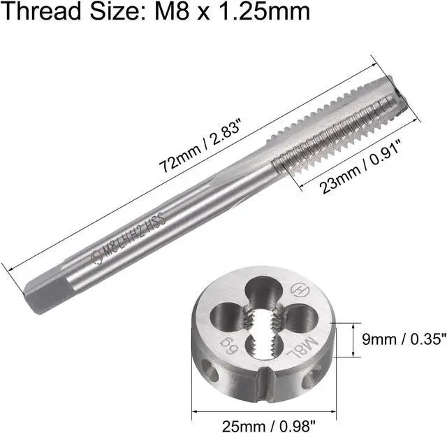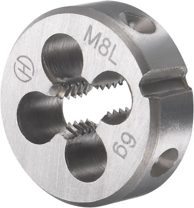 Round Die)Descriptions: 1. Tap and die set are suitable for making or repairing male and female threads, good for general purpose applications. Tap and die are both right hand thread. 2. Can be used to process through holes in maintenance and repair work. Great for drilling and tapping alloy steel, die steel, cast iron, ferrous and non-ferrous materials etc.. 3. High speed steel machine screw tap provides combination of hardness and toughness for wear resistance. Alloy tool steel round die features good abrasion resistance. Tap and die set are sharp and durable, and with clear threads to meet the processing requirements. 4. Round dies can be used with die wrench (not included). The fastening screw in the middle of the wrench should be inserted into the slot of the die and tightened. Machine taps are used on drill presses, tapping machines, CNC and milling machines. 5. Used with tapping oil can get high quality threads and make taps and dies more durable. Suitable lubricating oil should be added to the cutting edge of dies and taps when tapping.