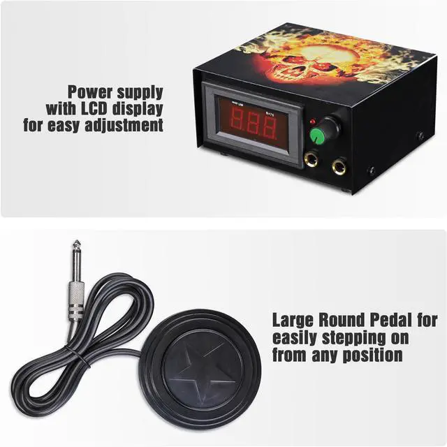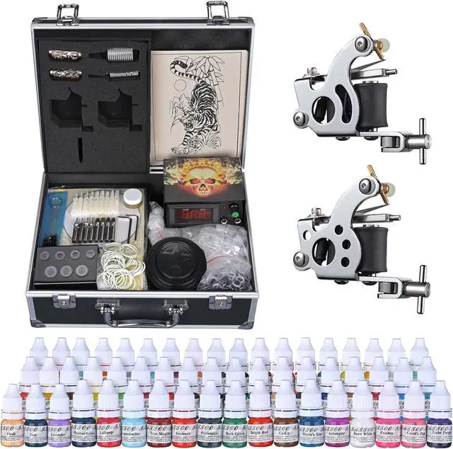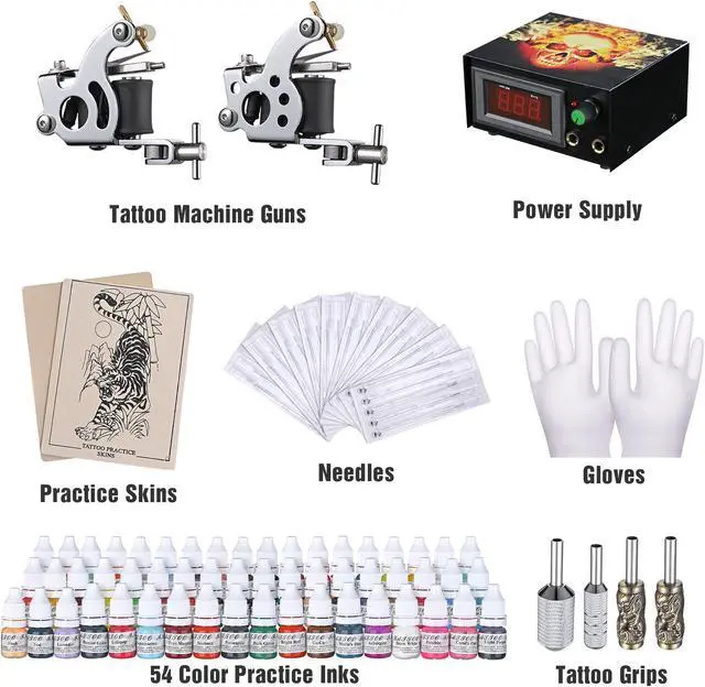 - Complete Tattoo Kit - Contains carrying case, 2 machine guns, a power supply, practice skin, 4 tattoo grips, needles, practice inks and other accessories, whole set helps you to make tattoo practice to improve skill; Perfect for tattoo artists, beginners, apprentice or tattoo lovers to practice in free time