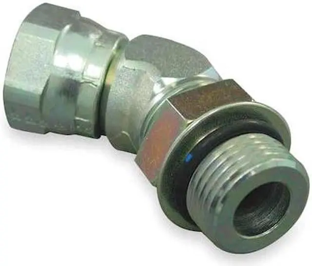 Hydraulic Hose Adapter, For Hose Type Hydraulic, Thread Size 3/8 In. -18, Fitting Shape 45 Degrees Elbow, Swivel, 4, 000 psi, Includes O-Ring Yes, Crimpable No, Compatible Pipe Size 3/8 in, Hose Fitting A Gender Female, Hose Fitting B Gender Male, Hose Fitting A Size 3/8 in, Hose Fitting B Size 3/8 in, Hose Fitting A Connection Type NPSM, Hose Fitting B Connection Type ORB, Fitting Material Carbon Steel x Carbon Steel, 12L14, 12L15, SAE/JIC 37 Degrees