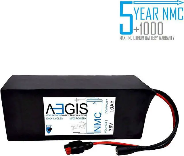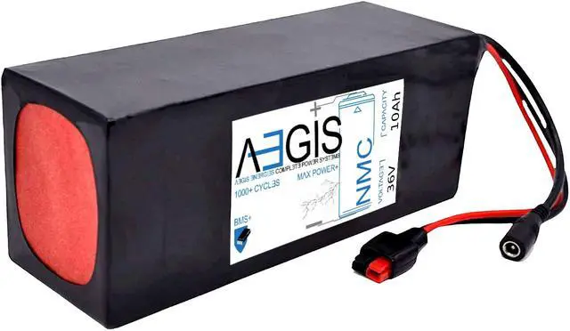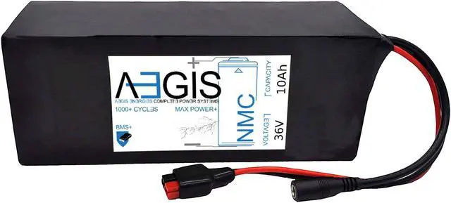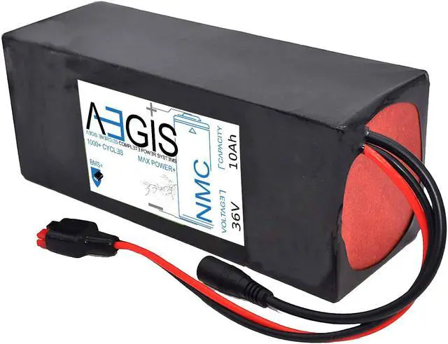 Aegis Battery 36V 10Ah NMC Lithium Battery + Charger. State of the art rechargeable battery pack made w/18650 Li-Ion cylindrical cells great for ebikes, scooters, robots, solar & high energy products.