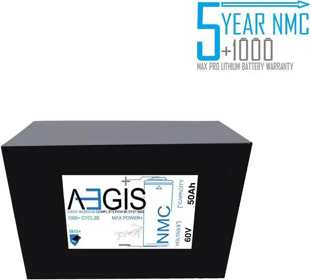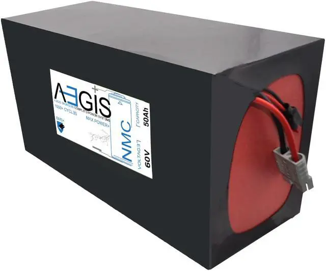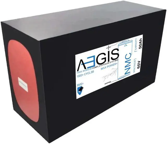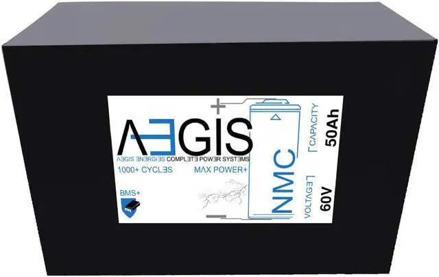 Aegis Battery 60V 50Ah NMC Lithium Battery + Charger. State of the art rechargeable battery pack made w/18650 Li-Ion cylindrical cells great for ebikes, scooters, robots, solar & high energy products.