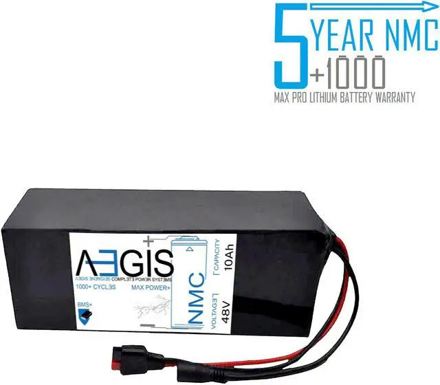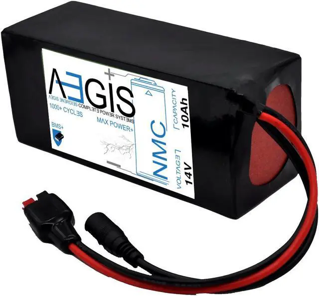 The Aegis Battery 14V 10Ah Li-Ion Battery is a state of the art rechargeable battery pack made with 18650 Li-Ion cylindrical cells packed with black PVC shrink wrap. It is perfect for bike lighting, RC toys, robots, laptops, and DVD external batteries. The battery comes with pre-assembled integrated Anderson Power Pole connectors allowing for easy compatibility. The Aegis battery has a built-in battery management system (BMS) that keeps the battery running at peak performance and protects the cells for thousands of cycles, including over-charge, over-discharge, over-current, and short-circuit protection.