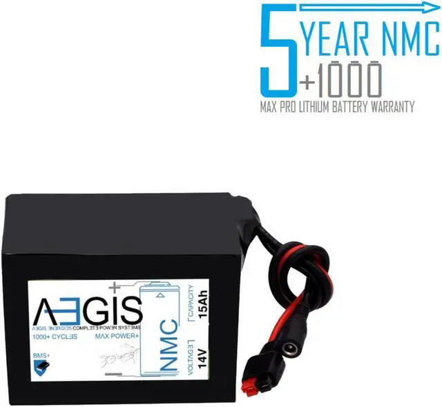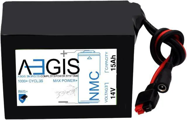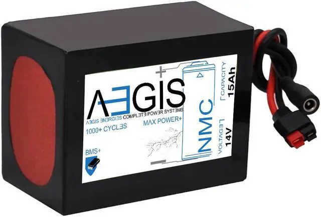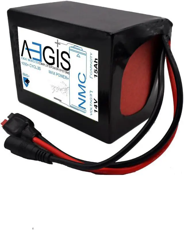 Aegis Battery 14V 15Ah NMC Lithium Battery + Charger is a state of the art rechargeable battery pack made with 18650 Li-Ion cylindrical cells. Great for ebikes, scooters, robots, solar & and more!