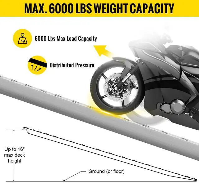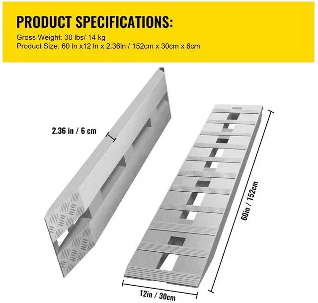 Material: Aluminum Capacity: 6000 lbs/2722 kg Capacity: 3000 lbs/1361 kg Each Overall Size: 60'' x 12''/1520 x 305 mm Thickness: 2.36 ''/60 mm Load Height: Up to 16''/406 mm