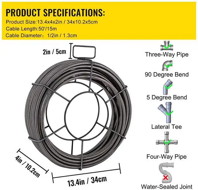 Drain Cleaning Cable 50 Feet x 1/2 Inch Solid Core Cable Sewer Cable Drain Auger Cable Cleaner Snake Clog Pipe Drain Cleaning Cable Sewer Drain Auger Snake Pipe