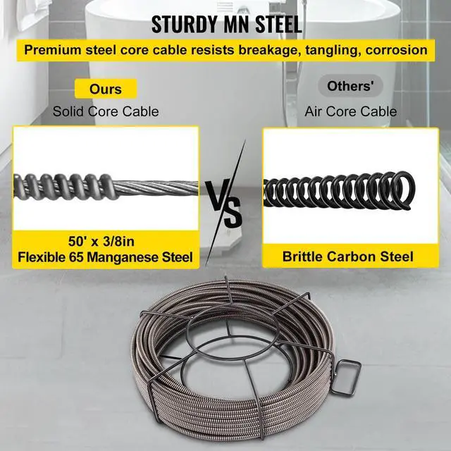 Drain Cleaning Cable 50 Feet x 3/8 Inch Solid Core Cable Sewer Cable Drain Auger Cable Cleaner Snake Clog Pipe Drain Cleaning Cable Sewer Drain Auger Snake Pipe