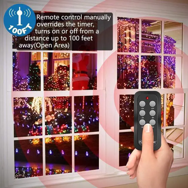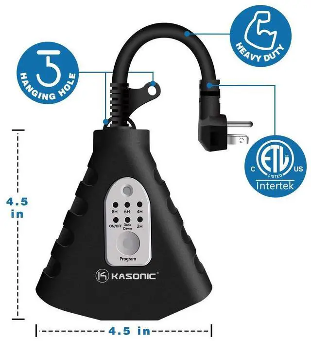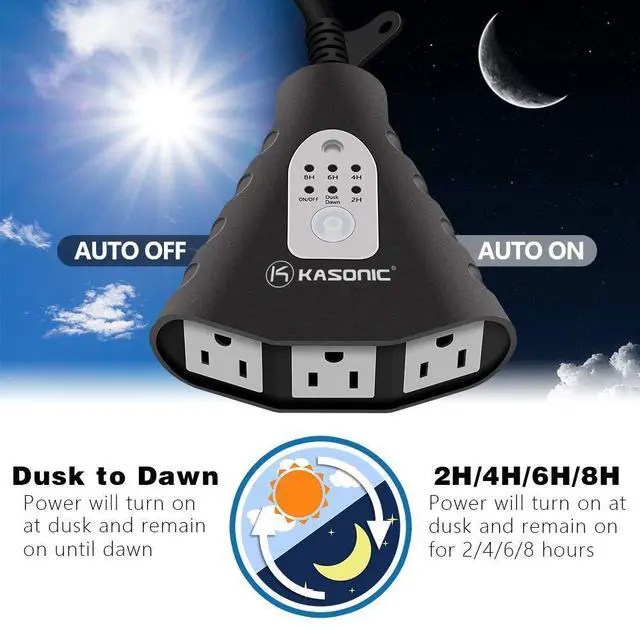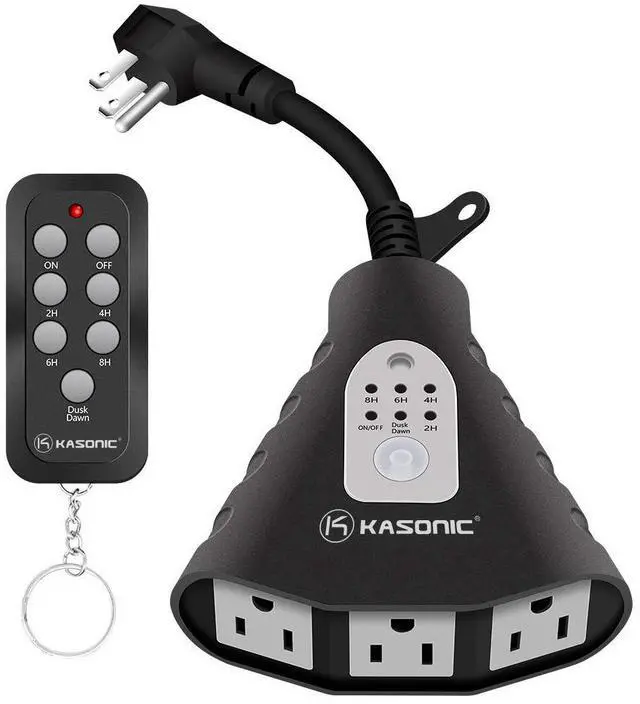 Kasonic Outdoor Timer with Remote Control, 3-Outlet. Control outdoor lights and animated holiday decorations with a push of a button from inside our home. Automatically on at dusk and off at dawn or programmable on at dusk and off 2, 4, 6, or 8 hours later. Remote control manually overrides the timer, turns lights on or off from a distance up to 100 feet away - with 3 grounded outlets. Compatible with CFL, LED & incandescent lighting.